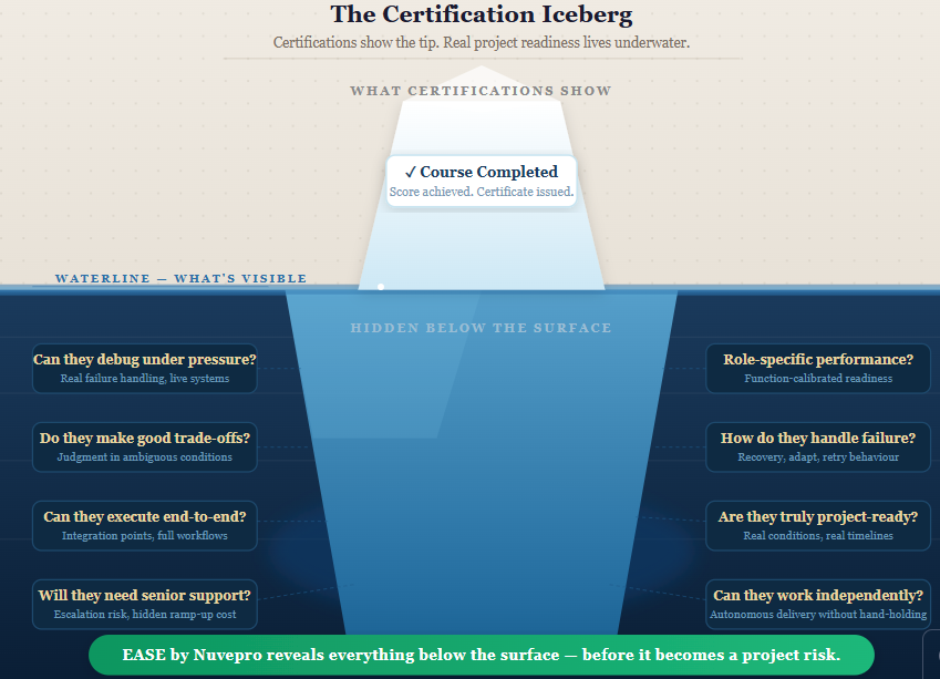 The problem is what enterprises did next. They took that confirmation of exposure and treated it as proof of readiness. They looked at a certified team and said, “we’re good to go” and sent them into live projects, real client environments, and high-stakes delivery situations based on that assumption.