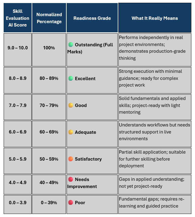 To keep results transparent and genuinely useful, EASE (Engine for AI-based Skill Evaluation) follows a clear and consistent way of scoring and normalizing every assessment. Each submission is first evaluated on a 0–10 scale. But that number isn’t the final output. It’s normalized into a percentage and then translated into a grade that reflects real readiness, not just performance in a test environment.
